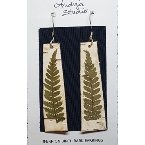 Pressed and dried Fern on Birch Bark Dangle Earrings on sterling silver french hook
