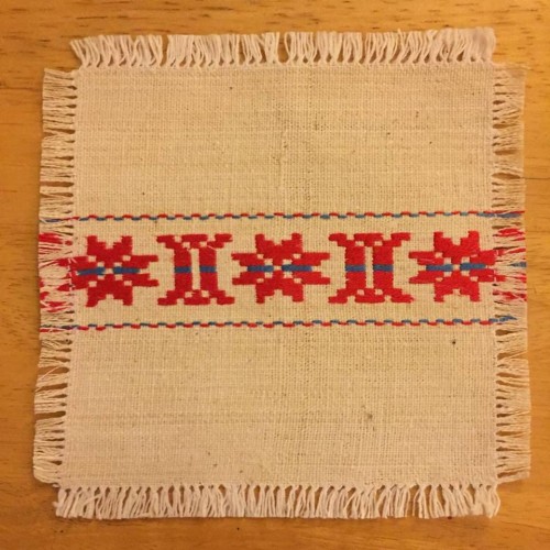 This is a flax prtiček or "napkin" from the Bela Krajina in Southeastern Slovenia. It is embroidered with a traditional design and has a fringe edge. The fabric is heavy and fairly stiff. It is 100% handmade, from harvesting the flax, weaving the fabric, and embroidering it.